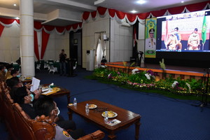Teleconference Bupati Kampar Catur Sugeng Susanto, SH yang didampingi oleh Forkompimda, Ketua Pengadilan Bangkinang Tri Unggul, SH. MH, Kepala Kejari Kampar Suhendri, SH, MH, Dandim 0313/KPR Letkol. Inf. Aidil Amin, S. Ip, Kapolres Kampar AKBP Muhammad Kholid, Sik yang diwakili oleh Waka Polres Kompol Ricky Ricardo, dan sejumlah kepala OPD dilingkungan Pemkab Kampar yang diadakan di Rumah Dinas Bupati Kampar.