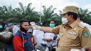 Rohul, detikinews.com — Ditengah maraknya penyebaran Corona Virus Desease (Covid 19) di daerah maupun luar daerah, sehingga sampai menjadi perhatian dunia saat ini, termasuk di Indonesia. bahkan di Rokan Hulu yang saat ini dalam kondisi waspada, maka Bupati Rokan Hulu H.Sukiman didampingi Ketua PMI Rokan Hulu Hj. Peni Herawati Sukiman, Sekretaris Daerah Rokan Hulu H.Abdul Haris, S.Sos.M.Si, bersama Forkopimda lakukan pembagian masker sebanyak 6 ribu secara gratis dan melakukan pengecekan suhu tubuh Kepada Masyarakat, Selasa 24 /3/ 2020, di beberapa titik seperti di Pasar – Pasar, salah satunya Pasar Modren Pasirpengaraian, Pasar Kecamatan Rambah Samo, Pasar Kecamatan Ujung Batu, Serta Simpang TB Kecamatan Tandun yang merupakan pintu Masuk ke Kabupaten Rokan Hulu, dari Kota Pekanbaru, Kampar, Bengkalis dan Siak.