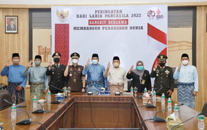 SIAK, detikinews.com — Bupati Siak Alfedri, didampingi Wakil Bupati Siak Husni Merza serta bersama Forkopimda mengikuti Upacara Hari Lahir Pancasila Tahun 2022, yang dilaksanakan secara terpusat di Kabupaten Ende Nusa Tenggara Timur (NTT) secara Virtual, bertempat di Ruang Rapat Zamrud Komplek Abdi Praja, Rabu (1/6/22).