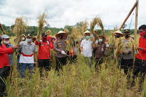 Kapolres Rohul AKBP Taufiq Lukman Nurhidayat SIK , MH melalui Paur humas polres rohul ipda refly setiawan SH Mengatakan kegiatan panen raya hasil tanaman padi kali ini diadakan di sebuah lahan kampung tangguh Nusantara berlokasi di Kampung Semeru Desa Sungai Kumango Kecamatan Tambusai Kabupaten Rokan Hulu Pada kamis 25/02/2021.
