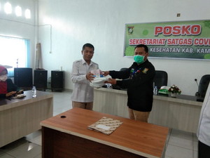Bupati Kampar menyerahkan langsung bantuan alat pelindung diri (APD) bagi petugas paramedis di Puskesmas dan RSUD bangkinang kepada Kepala Dinas Kesehatan Kampar Dedy Sambudi secara simbolis Rabu (1/4).