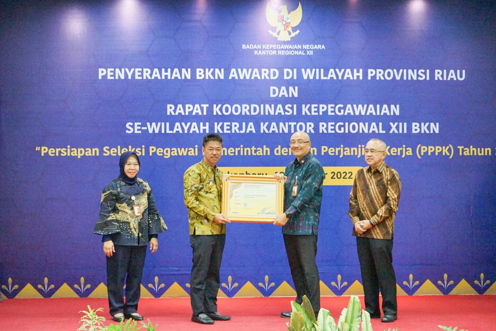BKN Award tersebut diserahkan langsung oleh Kepala BKN Dr Ir Bima Harus Wibisana MSIS kepada Bupati Rohil Afrizal Sintong didampingi wakil bupati H Sulaiman. Selain Rohil yang dapat penghargaan dari BKN Award 2022 ini juga diberikan kepada Pemprov Riau, Pemkab Dumai, Pelalawan, Kampar dan Inhil.