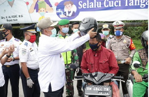Peluncuran Kawasan Tertib Protokol Kesehatan ditandai dengan peletakan batu pertama pembangunan alat peraga dan sosialisasi Protokol Kesehatan disekitar Bundaran Jembatan TASL. (inf)
